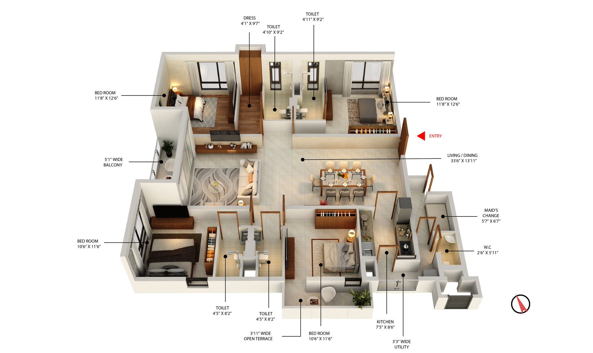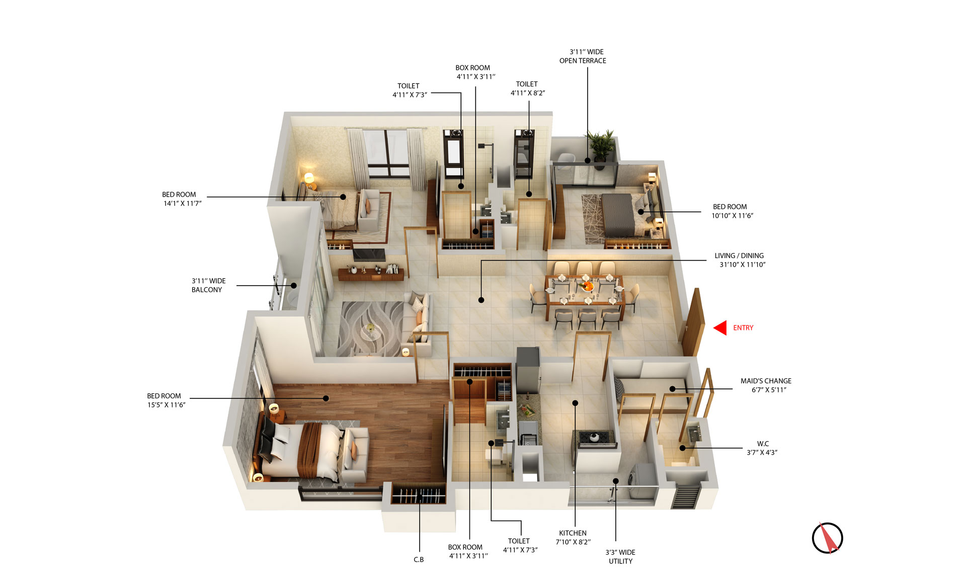 The Living Room is in the centre, surrounded by the bedrooms to enable family bonding and interaction.