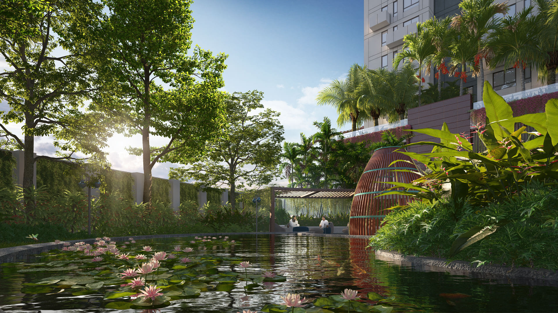 Senior citizen’s corner. Overlooking a lily pool, a swimming pool, sit-outs